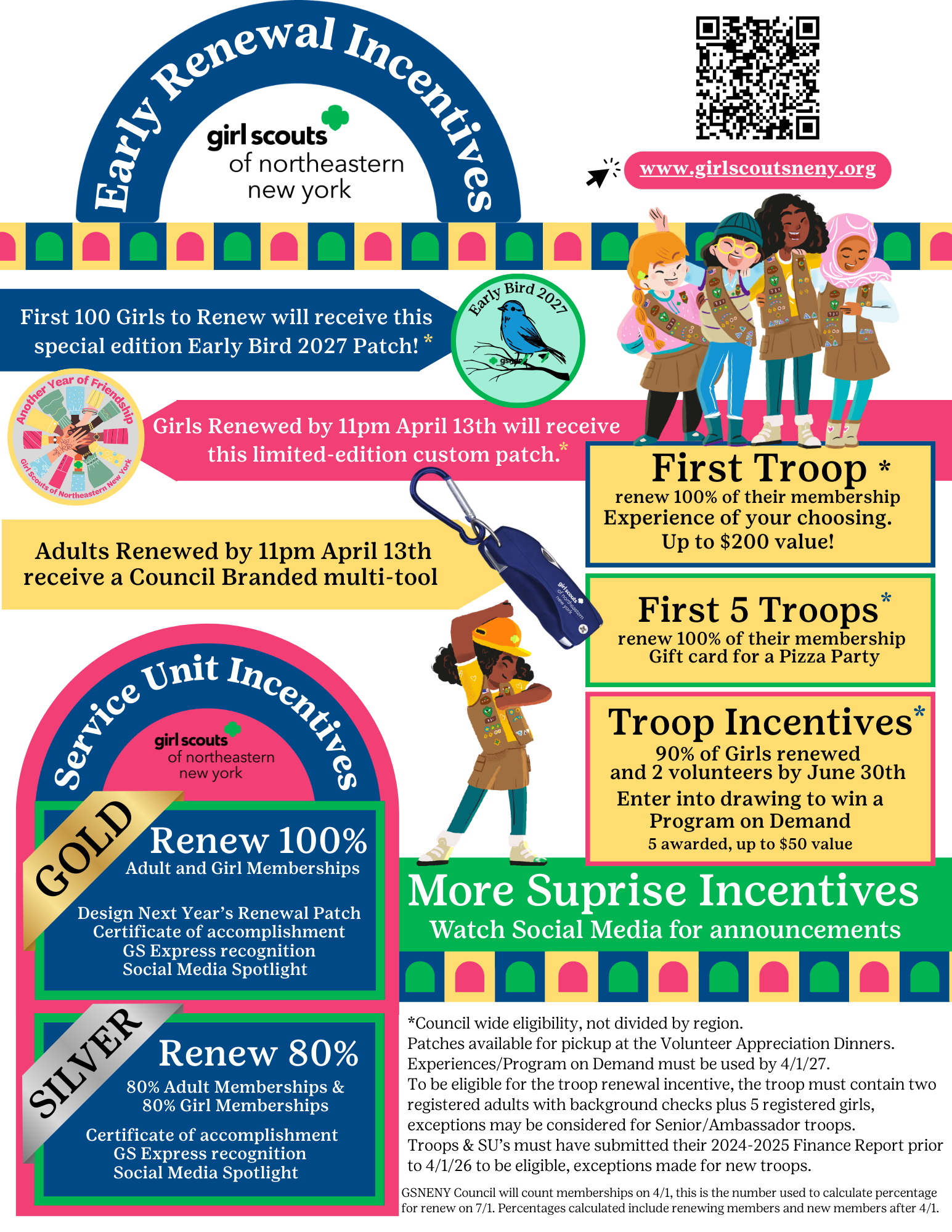 Girls who renew by April 13th will receive a limited-edition custom patch. Adults who renew by April 13th will receive a GSNENY branded multi-tool.